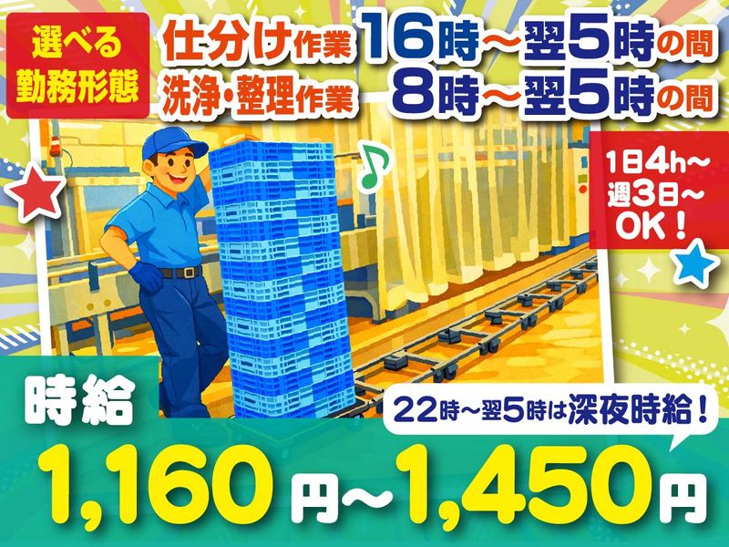 仕事内容 ✅ オススメポイント! ★未経験者大歓迎!未経験からサクッと稼ぎたい方にピッタリ♪ ★時給1160円~/22時以降は深夜時給にて時給1450円! ★仕分け or ケース洗浄で選べる作業形態 ★8時~翌5時 or 16時~翌5時の間で選べる勤務時間【1日4h~・週3日~OK】 ★車通勤OK!バイク、自転車通勤もOKです! ★学生、フリーターの方はもちろん、主婦(夫)さんも活躍中♪ ★仕事はカンタン・コツコツ作業で接客もナシ! ★倉庫内作業で、快適勤務♪ ★友達同士での応募もOK!お友達と一緒に楽しく働ける♪ ★長期で安定して勤務できる! ✅ 具体的には… ■ 仕分け・洗浄作業 ■  ̄ ̄ ̄ ̄ ̄ ̄ ̄ ̄ ̄ ̄ ̄ 大手スーパー物流センターでのお仕事です! \キレイな職場です/ 【1】仕分け作業 スーパー向けのチルド商品のカンタンな仕分け作業をお願いします。 ◎ チルド商品を配送先ごとに仕分け ◎ バーコードを読み取ったりするだけ! <男女ともに活躍中です★> 【2】洗浄・整理作業 チルド商品が入っていたケースの洗浄・整理作業をお願いします。 ◎ 洗浄は、機械のボタンを押すだけ♪ ◎ 一つ一つ洗って…なんて手間はありません! ◎ 洗浄作業ですが、靴や服が水に濡れたりはしません! ー どちらもカンタン倉庫内作業! 丁寧にお教えしますので、 安心してスタートしてください* ー ■ 勤務スタート時間例 ■  ̄ ̄ ̄ ̄ ̄ ̄ ̄ ̄ ̄ ̄ ̄ ̄ 【1】仕分け作業 └《16時~翌5時》の中で1日4h~、週3日~OK 16時~・17時~・18時~ 19時~・20時~・21時~ 22時~・23時~・24時~など 【2】洗浄・整理作業 └《8時~翌5時》の中で1日4h~、週3日~OK 8時~・9時~・10時~ 11時~・12時~・13時~ 14時~・16時~・17時~ 18時~・19時~・20時~ 21時~・22時~・23時~など …他にも勤務時間多数あり! ■ 事業内容 ■  ̄ ̄ ̄ ̄ ̄ ̄ ̄ 派遣業(派27-300815)