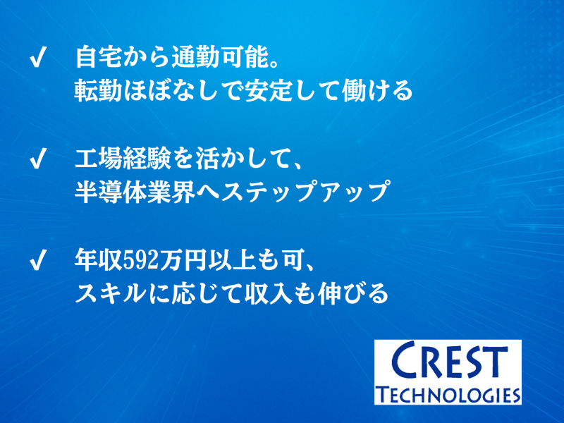 アピールポイント: ・工場経験を活かし最先端の半導体業界にチャレンジ ・国内外出張で技術と経験を積める ・年収592万円以上も目指せる高待遇 ・OJT研修+資格取得支援で長期的なキャリア形成が可能 ・将来的にリーダー・主任へのキャリアアップも可能