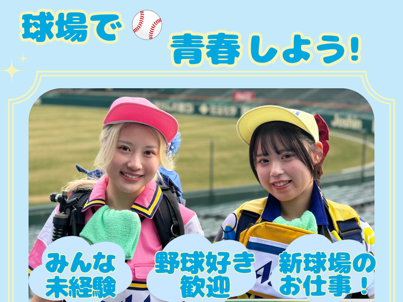 求めている人材 ★未経験・初心者OK! ★大学生・高校生・フリーター・副業の方など皆さん歓迎! ★高校生も給与同額です ※アルコール販売は高校2年生から ★制服あり <未経験歓迎!バイトデビューの方もOK◎> *野球好き *スポーツが好き *ワイワイ盛り上がるのが好き *楽しい雰囲気が好き という方にピッタリなお仕事です♪ 他にも… 高収入・高額バイトをお探しの方 カフェや映画館、飲食店(居酒屋、焼肉、ラーメン他) コンビニやスーパーなどでの品出し、レジ打ちなど、 接客や販売などのサービス系のお仕事探されてる方にもおすすめ! イベントやリゾート・リゾバなどの楽しいバイトを探してる方も必見! 短期で働きたい方も、まずはお気軽にご応募ください! カワイイ制服で、 売り子さんとして一緒に試合を盛り上げましょう☆
