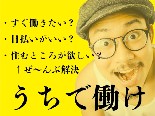 【保険制度】 雇用保険、労災保険、健康保険、厚生年金 待遇・福利厚生 ●急な出費も安心! 「全額日払い制」 →勤務後、当日に現金手渡し! ★友達と食事!デート!レジャー!など 遊び予定に合わせて働いて現金をゲットできます! ●経験や資格に応じて日給アップ! ●残業時は別途、残業手当を支給 【特別入社手当】 ・作業用品プレゼント ・寮費1ヶ月無料 ※すべて当社規定により支給。 加入保険 健康保険あり・厚生年金あり・雇用保険あり・労災保険あり