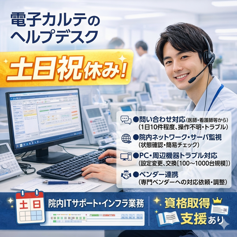 仕事内容 【仕事内容】 総合病院内に常駐し、電子カルテシステムに関するヘルプデスク業務を担当します。 【具体的には】 ・電子カルテおよび院内システムの問い合わせ対応 医師や看護師からの「画面が表示されない」「操作方法が分からない」といった問い合わせに対応(1日10件程度) ・院内ネットワークやサーバの状態確認 システムが正常に稼働しているかの確認や簡易的なチェック業務 ・PCや周辺機器のトラブル対応 PC、プリンター、情報端末、バーコードリーダーなどの不具合確認、設定変更、交換対応 ※端末数は100台~1000台規模 ・ベンダーとの連携 自分で解決できない障害については専門ベンダーへ連絡し、対応依頼や調整を行う 【この仕事のメリット】 ・ITインフラの知識や経験を活かせる環境 ・資格取得支援制度ありでスキルアップ可能 ・土日祝休みでプライベートと両立しやすい ※本求人は株式会社エキスパートパワーシズオカ(派遣元)による派遣求人です