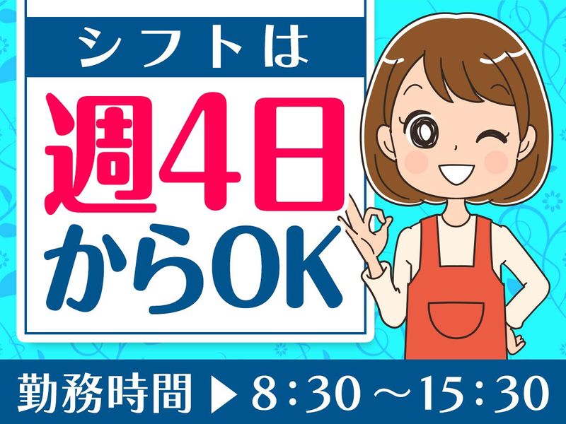 勤務時間詳細 【勤務時間】 8:30~15:30(実働6.5時間・休憩30分) ※多少前後あり ★週4日~OK!土日できる方歓迎! ★家事と両立し易い時間帯なので子育てママも活躍中! ★夕方や夜からは別のお仕事と掛け持ちしている方もいます