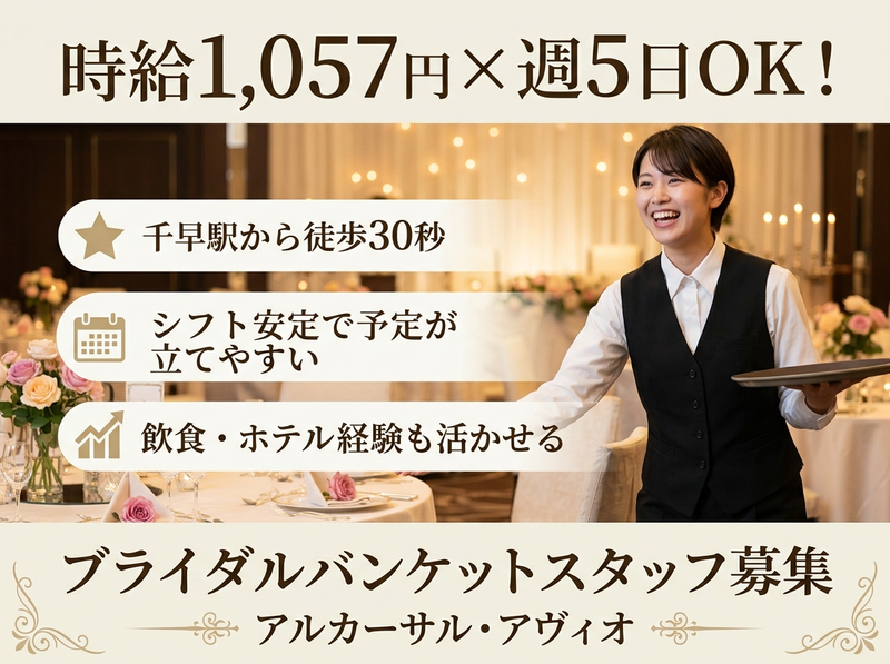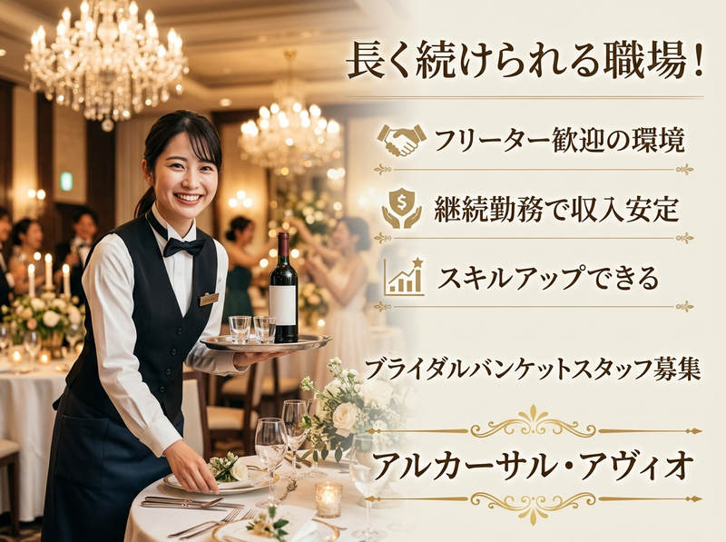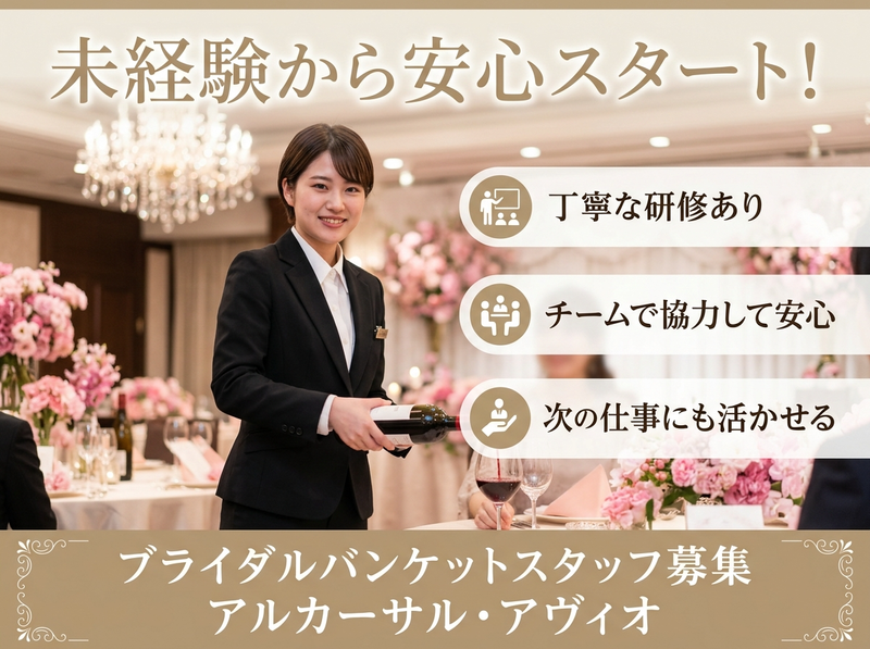 仕事内容 結婚式場「アルカーサル・アヴィオ」にて、 披露宴やパーティーのサービス業務をお任せします。 【主なお仕事内容】 ⏩料理・ドリンクの配膳 ⏩会場セッティング・準備 ⏩ゲストのご案内 ⏩披露宴中のサポート ⏩片付け ✨チームで動く仕事なので未経験でも安心 ✨慣れてくると効率よく動けるようになります 【⭐アピールポイント】 ⭐しっかりシフトに入れる環境 土日中心に安定して勤務可能 ⭐フリーター活躍中 同じ働き方のスタッフが多く馴染みやすい ⭐未経験からでも安定して働ける 研修ありで安心スタート ⭐接客スキルが身につく 飲食・ホテル・接客経験にもつながる