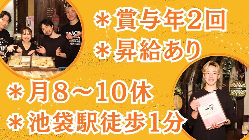 仕事内容: __________ 飲食の仕事は好き。 でも、今の職場をこのまま続けるのは違う。 __________ そんな気持ちを抱えながら働いていませんか。 ・毎日忙しいのに、成長している実感がない ・頑張っても評価や給与に反映されにくい ・人を喜ばせる仕事のはずなのに、余裕がない ・この先のキャリアが見えない ・もっと良い環境で、飲食を続けたい もし少しでも当てはまるなら、 一度この求人を見てください。 私たちが求めているのは、 ただ人手を埋めるための正社員ではありません。 これからの店を一緒につくっていく仲間です。 新店OPEN。 今だからこそ、中心メンバーとして入れます 翠商事株式会社は、 創業70年にわたり地域に根ざして焼き鳥事業を続けてきた会社です。 その中で育ってきたのが、 27年続く『焼き鳥ダイニング 一翠』。 長く愛されてきた土台がある。 そのうえで、これから新しい出店や展開にも挑戦していく。 今回の募集は、そんなタイミングです。 ゼロからの不安定な立ち上げではなく、 実績ある会社の基盤がある新店。 だからこそ、安心感も成長機会もあります。 __________ お任せする仕事 __________ まずは、店舗スタッフとして 仕込み・焼き場・ホール業務など、 店舗運営に必要な仕事を幅広く担当していただきます。 具体的には、 ・仕込み ・焼き場での調理 ・接客、配膳 ・ドリンク作成 ・開店、閉店準備 ・アルバイトスタッフとの連携 ・店舗運営のサポート 経験や適性に応じて、将来的には ・スタッフ育成 ・シフト管理 ・売上管理 ・原価管理 ・店舗づくり などにも関わっていただけます。 ただ働くだけで終わらず、 一段上の経験が積める環境です。 __________ この仕事の魅力 __________ 1.月給32万円以上からスタート 飲食業界の中でも、スタート給与は高めです。 経験や実力に応じて、しっかり評価していきます。 2.新店OPENのタイミングで入れる すでに完成された場所に入るのではなく、 新しい店づくりに関われます。 これは今の時期ならではです。 3.池袋駅徒歩1分の好立地 通勤しやすさは、長く働く上でかなり大事です。 駅チカなので、毎日の負担も抑えられます。 4.70年の土台がある会社で働ける 個人店のような不安定さではなく、 長年続いてきた実績とノウハウがあります。 5.飲食の仕事を、将来につながる経験にできる 仕込み、焼き、接客だけでなく、 店舗運営やマネジメントにも関わっていけます。 ____________________________________________________