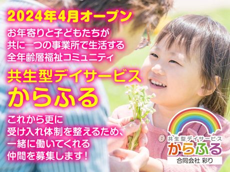仕事内容 生活支援スタッフ ご高齢の方から、障がいをお持ちの大人の方、そしてお子様まで、 幅広い世代の利用者様が通われるデイサービスでのお仕事です。 利用者様一人ひとりが、日中を楽しく安心して過ごせるよう、 日常生活のサポートをお願いします。 <具体的な仕事内容> 利用者様の支援サポート、 調理補助、送迎、 入浴介助、排泄介助、食事介助、 PC入力業務 共生型デイサービスからふるは 私たちの施設、共生型デイサービスからふるは 施設誕生してまだ1年の スタートしたばかりの施設です。 スタッフは現在5人で、 支援スタッフが 60代前半女性、 50代前半女性、 20代後半女性。 送迎の70代男性、 そして管理者のわたし古谷勇二が40代です! アットホームが最大の強みです(笑) 利用者様の受け入れ体制を整えるために 今回、一緒に働いてくれる仲間を募集します! 先輩後輩なんて堅苦しい事もなく みんなが平等な施設です。 勤務は日勤だけですので、 介護、障がいサービス、放デイ経験者や、 現在求職中の主婦の方など 是非見学にきてくださいね。 心も身体もプラスになる場所。 そんな施設を目指しています。 私たちの会社「彩り」は 高齢者から障がいのある子どもまで 全年齢層の利用者様が対象です。 いろいろな色を持った個性が 集まる場所として彩りと言う社名と、 からふると言う施設名をつけました。 共生型デイサービスからふるの「共生型」ってなに? 私たちの施設は、 お年寄りと子ども達が共に ひとつの事業所で生活するデイサービスです。 子どもと、おじいちゃん、おばあちゃんの ふれあいで相手を敬い、大切にする心を育てます。 全国的にもとても注目されており、 福山でも数少ないサービスなのですよ。 私たちの事業内容の説明をしますね。 ●通所介護サービス 少人数のデイサービスなので 落ち着いた環境で過ごしてもらいます。 また様々な世代と交流するので、 高齢者デイサービスでは体験できないことを 感じてもらいます。 ●生活介護サービス 一般的な住居をリフォームしています。 家にいるかのような落ち着いた環境の 生活介護は福山ではあまりありません。 落ち着いた環境での生活支援の他に、 内職作業、ヘルパー助手制度、 自社製品の作成に取り組んでもらっています。 ●放課後等デイサービス おじいちゃん、おばあちゃんの家に来たような、 落ち着いた環境で過ごしてもらいます。 いろいろな世代と関わりが持てるのも特徴のひとつです。 おじいちゃん、おばあちゃんが困っていたら 助けてあげるなど、人を思いやり大切に出来る 情操教育に繋がっています。 \1日のスケジュール/ 8:30 お迎え : 9:30~10:00 休憩 : 10:00~12:00 午前の活動 : 12:00~13:00 昼食・昼休憩 : 13:00~15:00 午後の活動 ※13:00放デイ児童お迎え : 15:00~15:30 おやつ(買物学習) : 15:30~17:30 自由時間 【お送り時間】 ●通所介護(1)15:30/(2)16:30/(3)17:30 ●生活介護16:30 ●放デイ17:30