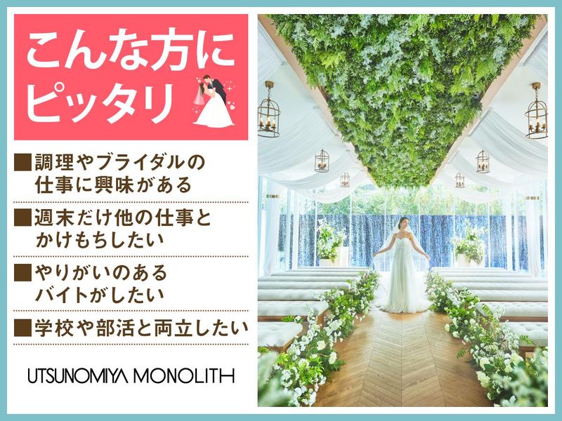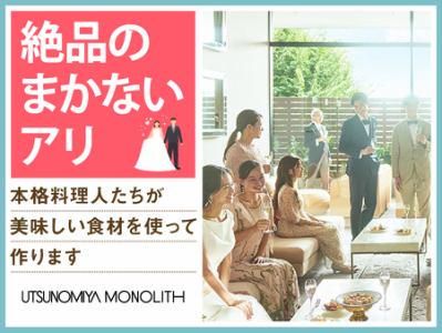 仕事内容 *水と光が彩るスタイリッシュなブライダル会場* 感動いっぱいの結婚式を一緒にサポート♪ 週1~の柔軟シフトでWワーク・副業OK! 主婦パートさん・フリーターさん歓迎♪ 「人が喜ぶ姿が好き」「サプライズが好き」 という方必見!スキルや経験は一切不要♪ 一緒に素敵な結婚式を演出しましょう* 宇都宮モノリスは、 1100坪もの広大な敷地に広がる ウエディング 邸宅。 光・水・緑に包まれる心地よい空間! ウェディングのお手伝いをするお仕事です◎ <主なお仕事内容は…> お客様に提供する料理の 簡単な調理と盛り付けをお任せ◎ 心を込めて調理をしテーブルが 華やぐように綺麗に盛り付けます♪ 他にも洗い場での洗い物作業も お任せします。 未経験でも先輩が丁寧にお教えするので安心! 一流シェフの技を学べるチャンス! ―――――――――――――――― フリーター・パート主婦・学生 オススメのポイントはこちら★★ ―――――――――――――――― ・週1日~1日4時間~OKで融通◎ ・本業が休みの土日だけ等大歓迎! ・かけもち・副業OK! ・絶品のまかないアリ(^^) まかないは本格料理人たちが 美味しい食材を使って作ってくれます♪♪ ―――――――――――――――― 未経験者歓迎! みんなで助け合う雰囲気です ―――――――――――――――― 「働くこと自体久しぶり…」 「調理が初めてで不安」 そんな方もご安心ください。 不安がなくなるまで、 スタッフ全員でサポートします◎