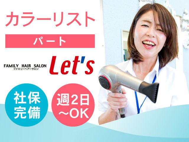 仕事内容 《 パート 》カラーリスト募集! 未経験・ブランクOK! あなたのスケジュールに合わせて 無理なく勤務できます! ブランクがあってもご安心ください。 ブランクから復帰されたスタッフが 多数している美容室が【Let's】です! もう一度美容師としてスタートしませんか? /////// POINT ///////// ◎週2日~勤務OK! ◎1日4H~OK!時短勤務も可能! ◎5年~10年のブランクからの 美容師スタッフが当社で 多数復帰して活躍しています!! ◎入社前の事前研修があり安心! ◎扶養範囲内OK! ◎主婦(夫)さん、 子育てママさん活躍中! ◎40代、50代、60代の 中高年、ミドル世代活躍中! ◎カラー、シャンプーのみOK! ◎残業なし! =============== ・社会保険完備 ・有給休暇年間12日間(月1日程度) ・・・など、福利厚生充実! なので、在籍年数10年以上のスタッフが、 300名中120名以上! 創業40年、信頼と実績のある企業 株式会社ユーアンド・美容室レッツで 長期に安定してお仕事しませんか。 =============== <募集職種> パート/美容師(カラースタッフ) <仕事内容> カラーやシャンプーなどを メインとした施術をお願い致します。 カラー・シャンプー専門なので パーマやカットは一切ありません。 1日4時間から勤務可能なので 短時間から勤務できます。 また、オートシャンプーを導入しているので 手荒れや腰痛、体の不調などで 断念した方も安心して働ける環境です。 <予約制・指名制なし> 予約や指名中心の店舗ではありませんので、 たくさんのお客様に入客するチャンスがあります。 受付もあるので個々の負担が少ないのも魅力です。 〈 安心のサポート・教育体制〉 現在活躍しているスタッフは 【5年以上/6割・10年以上/4割】 ブランクから復帰している実績有り! 配属前に本部研修を実施しています。 技術教育動画も充実していますので、 安心して現場に復帰可能です! また、店舗での日々の研修の他に、 希望者のみ、 ・本部でのカット講習 ・インストラクターによる、 ワインディングやカラー塗布などの 講習も実施しております。 < 40歳以上の方も多数活躍中! > 長く現役で働けるのも魅力の一つ。 年齢不問で活躍できます! 30代・40代の女性を中心に 20代~50代・60代まで幅広く活躍。 勤続10年以上のスタッフが 約120名在籍しています(2024年3月現在) 〈お客様の客層について〉 白髪染めメインのご来店も多く、 シニア世代の方々にも多数ご来店・ ご好評いただいています。 (65歳以上/30%、お子様/30%) < 日数・時間の相談のOK > ご家庭や育児を優先して働けるよう、 都合にあわせてお仕事可能です! 周りには同様の境遇のスタッフも いるので、協力体制もバッチリなので 安心してお仕事ができます。 〈将来的にステップアップ可能〉 カラー専門のスタートでも 希望があればカラーだけでなく、 アシスタント、スタイリストへの お仕事チェレンジもOK! 新たなステップへスキルアップももちろん可能! ・・・・・・・・・・・・・・・・・・・・・・・・・・・・・・・・・・・ ハローワークで探してるけど なかなかみつからない… 時間の融通がきく働き方をしたいなど まずはお気軽にお問合せください! ・・・・・・・・・・・・・・・・・・・・・・・・・・・・・・・・