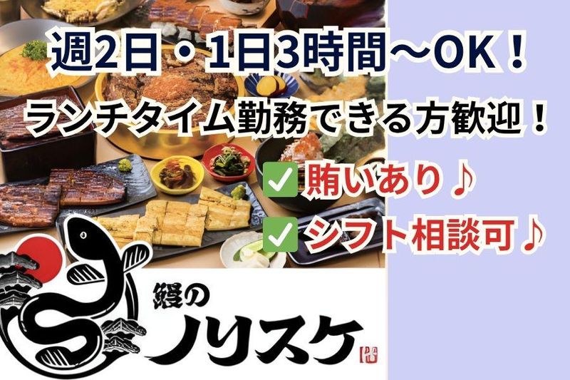 仕事内容 30店舗以上のオシャレなお店が立ち並ぶ 中区栄の商業施設 マルエイガレリア3階 【鰻のノリスケ】にてスタッフを募集✨ \この求人のポイント✨/ ⭐マルエイガレリア内勤務 出勤前や退勤後にショッピングもできる! ⭐栄駅直結!駅近5分以内 雨の日も通勤ラクラク ⭐幅広い世代が活躍中 学生さん・フリーターさん・主婦(夫)さんなど活躍中! ⭐週2日~&1日3時間~OK シフト融通ばっちりで働きやすい! ⭐美味しいまかないあり スタッフから大好評! ⭐ネイルOK、ピアスOK 髪色自由でオシャレに働ける! \こんな方にぴったり/ ・まかないありで節約したい方 ・オシャレ自由で自分らしく働きたい方 ・お昼時や短時間のお仕事を探している方 ・扶養内やWワークで働きたい方 【鰻のノリスケについて】 厳選された鰻を使用し、ふんわりパリッと! 鰻重や鰻を使った料理がお楽しみ頂けます。 お昼は定食スタイル、夜は居酒屋として、幅広い年齢の方が楽しめるお店を目指しています。 ======== ✅ランチタイム勤務できる方歓迎! ======== 「お昼の時間だけ働きたい」「無理なく続けたい」という方にピッタリ✨ 週2日・1日3時間~の短時間勤務もOKで、家庭や学校・Wワークなどそれぞれの生活スタイルに合わせて柔軟に働けます! さらにスタッフ同士の人間関係も良く、未経験の方でもすぐに馴染めて安心してスタートできる環境です。 「栄駅」徒歩5分&駅直結で通いやすく、オシャレなマルエイガレリア内勤務なので、働くモチベーションも自然と上がります✨ 【お仕事内容】 ホール&キッチン業務をお願いします お昼帯メインに勤務できる方は大歓迎です □ホール業務 └お客様のご案内/オーダー取り └フードの配膳/レジ会計 など □キッチン業務 └料理の仕込み(食材のカットなど) └盛り付け/洗い物 など 充実した研修があるので未経験も安心 ✨ 【月収例】 ✅週3日でランチ3時間だけ働く主婦さん 月収例4万3200円 (時給1200円×1日3h×週3日) ✅週5日でランチ3時間だけ働く大学生さん 月収例7万2000円 (時給1200円×1日3h×週5日) ✅週5日で夕方~ラストまで働くフリーター 月収例15万円 ((時給1200円×1日5h)+(深夜時給1500円×1日1h))×週5日)