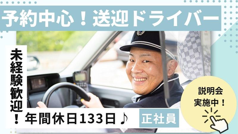 仕事内容 〜 年齢を重ねた今こそ、経験が《武器》になるタクシードライバー 〜 〇 無線配車・予約送迎中心で流し営業ほとんどなし 〇 運転経験や接客経験をそのまま収入に活かせる 〇 40~50代・ブランクがある方も歓迎 〇 固定給+歩合で安定収入 〇 毎日帰宅可能で家族や趣味の時間も確保 地域密着で、身体に負担の少ない勤務が可能なタクシードライバーのお仕事です。 <仕事内容> ・病院や高齢者施設への送迎 ・一般の個人予約による送迎 ・観光案内・地域イベント時の送迎 ・車両管理 など ※ブランクがある方や、これまでの運転経験を活かしたい方も歓迎 ※前職がバス運転手や大型ドライバーなど、さまざまな経歴の方が活躍中! <この仕事の魅力> ◎安定した収入 固定給+歩合で毎月の収入も安心。 「今日はお客様が少なかった…」という心配も不要です。 予約や無線配車中心なので、未経験でも安定した歩合が得られます。 ◎毎日帰宅できる 長距離運行や宿泊シフトはありません。 家族との時間も確保でき、趣味やプライベートも充実。 「子どもとゆっくり話せるようになった」 「趣味のゴルフを楽しめる」など、生活のリズムも整いやすいです。 ◎同世代が多数活躍 40~50代の転職者も多数在籍。 年齢やブランクに関係なく、運転経験や接客経験を活かして新しいキャリアをスタートできます。