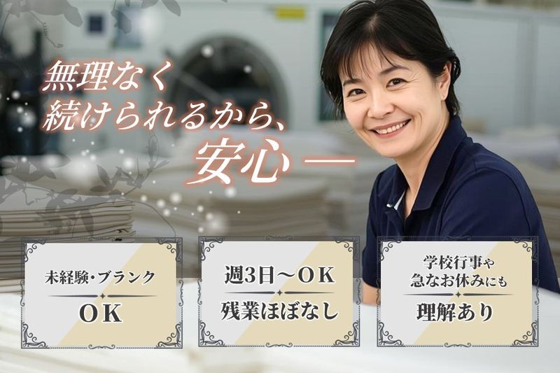 【アピールポイント】 【一枚のシーツから無数の笑顔を】 たくさんの人たちの快適を毎日、支え続けるお仕事です! ✅未経験・ブランクOK!20代~50代まで幅広く活躍中 ✅週3日~・フルタイムもOK!ライフスタイルに合わせて働ける ✅正社員登用制度あり!安定して長く働きたい方にもぴったり! ✅空調完備の清潔な工場で、シンプル作業から安心スタート!