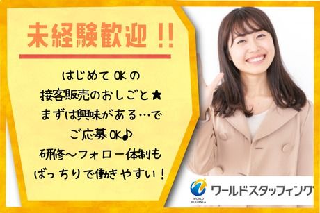 資格 **未経験スタートの方大歓迎** 20代~40代の男女スタッフ活躍中! ・接客販売、イベントスタッフの経験者大歓迎♪ ・PCの基本操作が出来る方 ・人と話す事がスキな方 どしどしご応募ください( *´艸`)♪