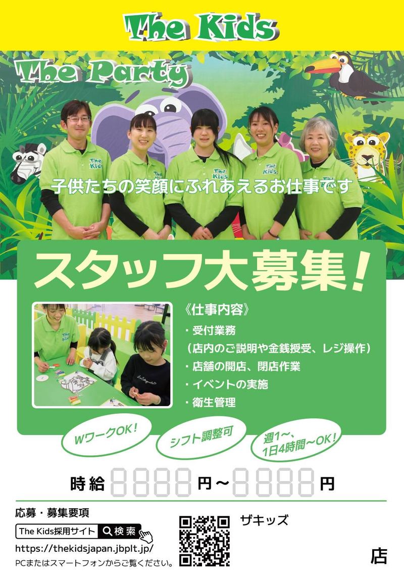 仕事内容 4月オープン予定! オープニングスタッフ大募集♪ \ 今日も遊びに来たよー (^O^) / ♪ …そんな、カワイイ “常連さん” が 今日もたくさん訪れる、 そんなバイト先、なかなかないですよ。 ━━━━━━━━━━━━━━━━━━ 話題! The Kids(ザ・キッズ) 「室内遊園地」staff 増員! ━━━v━━━━━━━━━━━━━━ ✨ 子ども達の笑顔に癒されるお仕事 ✨ <土日祝:最大時給1250円> ✨ <週1日~OK> <土日祝のみも可> ✨ タブレット導入でレジも簡単♪ ✨ <施設格安>で利用OK♪ ━━━━━━━━━━━━━━━━━━ ♪ \ 「The Kids」は こんなトコ / お子様はもちろん、パパ・ママ、 ご家族みんなで安全に楽しめる! (^^) …そんな人気の「室内遊園地」。 郊外型のショッピングセンターを中心に 巨大ジャングルジム や ボールプール、 トランポリン、ふわふわやゲーム …etc 広々としたスペースで、 大人も子供も“思いっきり” 遊べるアイテムを多数そろえ、 今日も笑い声(歓声?)の絶えない 屋内・室内型テーマパーク施設です♪ <対象のお子様は…??>、 主に、幼児から小学校低学年 ぐらいまでです p(^-^)q ♪ \ こんな「お仕事」を アナタと! / ■ 受付 → レジはタブレット操作 ■ 開店 & 閉店の準備 → 店内の清掃や遊具の点検 ■ 施設内の見回りCHECK ■イベントの実施 …慣れてきたら 新しいゲームや遊具のアイデアも 大歓迎! (・v・)b ぜひ! 一通り、研修やマニュアルも ありますので大丈夫ですよ。 接客やサービスのバイトが初めての方も ブランクや働く時間帯を相談したい方も まずはお気軽にお問合せくださいね! (※事前見学もご希望OK) \ 土日祝勤務できる方歓迎! / ♪ ♪