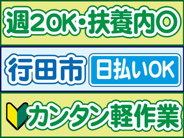 仕事内容 空調完備でかんたん、モクモク軽作業スタッフ 50代60代の中高年・シニアも活躍中 「軽作業スタッフのポイント」 〇未経験OK 〇服装・髪色自由 〇時給1200円スタート 〇日勤 〇週2日~勤務OK 〇シフト制(日曜休み) 〇扶養内・WワークOK 〇20代30代40代50代60代の男女活躍中 〇日払いOK(規定内) 〇履歴書不要 〇交通費支給(規定内) 〇「マイリク定着支援」導入企業! 「軽作業スタッフの仕事内容」 行田市内の物流倉庫でのお仕事 具体的には 通販商品向け小物雑貨の 〇検品 〇梱包 〇ピッキングなどを中心に 〇販促用のチラシを折りたたむだけの、 モクモク作業もあったりします 扱っているのは ポータブルのDVDプレイヤーや 人気クッションなど、 テレビやSNSで見たことのある商品ばかりです 職場見学(30分以下)を実施しております。 「軽作業スタッフの勤務について」 ・日勤 9時~17時(実働7時間) ・シフト制(日曜定休)※週2~OK 急な発熱・体調不良・冠婚葬祭など、 突発的なお休みに柔軟に対応しております。 「下記経験者は前職活かせます。」 〇製造パート・アルバイト 〇仕分け・ピッキングパート・アルバイト 〇梱包・箱詰め・包装パート・アルバイト 〇検査・検品パート・アルバイト 〇軽作業パート・アルバイト 〇製造関連業パート・アルバイト 〇倉庫内派遣 〇主夫パート・中高年パート(職種不問) 前職不問で採用しております。 ブランクOK、経験の浅い方もOK ご不明な点はお気軽にお問い合わせください。 お電話でのご応募、ご質問も受付中! 株式会社ロフティー 熊谷支店 担当営業、または採用担当まで TEL0800-222-6888(フリーダイヤル) お仕事情報などはこちら https://entori.jp/lofty-saitama コーディネーター・定着支援のWサポート体制導入 「マイリク定着支援」導入企業! アンケートで職場の様子を確認し、 コーディネーター・定着支援担当が連携してサポート。 はじめての派遣でも安心して働けるよう迅速かつ 丁寧にサポート対応いたします。