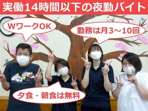 実働14時間以内と短め◆Wワーク可能♪1夜勤2万2000円◎月3回~10回の勤務★マイカー通勤可能☆駅チカ徒歩3分◇【四日市市、特養、河原田駅、介護福祉士、夜勤アルバイト】