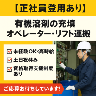 仕事内容 ラベル貼りからスタートできる♪ カンタン機械オペレーター×出荷補助 ――――――――――――――――― ✅ 将来的に正社員登用のチャンスあり ✅ 未経験からでもスタートOK!資格取得支援あり ✅ 高時給1,400円~1,500円&残業少なめ(月5時間程度) ✅ 年間休日126日(土日祝休み+長期休暇)でプライベート充実 ✅ 30代スタッフ活躍中!落ち着いた雰囲気の職場 ――――――――――――――――― 化学製品(有機溶剤)を扱う製造工場にて、 製品のラベル貼りや充填オペレーター作業、出荷前準備などをお任せします。 入社後すぐはカンタンな作業からスタートし、 ゆくゆくは機械操作や物流補助にもチャレンジしていただきます! 【主な業務内容】 ・一斗缶にラベルを貼る作業(最初にお任せする基本業務) ・ラベルと伝票の内容をチェックし、製品を隣のラインへ配置 ・有機溶剤の自動充填機オペレーター業務 └ 石油缶をセットし、パネル操作で所定量を充填 └ ふた締め・ラベル貼付・最終チェックまで対応 ・出荷前のパレット積込作業 └ 汚れや漏れがないかチェックしながら整理 ・フォークリフトによる運搬作業(免許保持者のみ) └ 製品を倉庫や出荷スペースへ移動 └ トラックへの積込作業もあり ※フォークリフト免許をお持ちでない方も歓迎! まずは補助業務からスタートし、 資格取得支援制度を利用してステップアップできます。 【職場の環境】 営業担当が実際に職場見学をしてきました! その中で感じた「安心ポイント」をご紹介します。 【1】スポットクーラー&扇風機完備! 作業場内は熱がこもりやすいため、 スポットクーラーや扇風機をしっかり設置。 実際に中に入ってみましたが、 「暑すぎて無理!」というようなことはありませんでした◎ 【2】職場の雰囲気がとても良い! 現場で対応してくださった課長さん・部長さんは、 初対面でもとても気さくで、 作業内容についても丁寧に教えてくださいました。 現場スタッフの方々も明るく挨拶してくれ、雰囲気の良さが印象的でした! 【3】まずはカンタン作業から! 最初にお任せするのは、ラベル貼りや伝票チェックなどの軽作業。 一斗缶の運搬も、「何メートルも持ち運ぶ」というようなことはなく、 隣のラインにちょっと動かす程度なので、負担はかなり少なめです。 【4】リフト資格がなくても大丈夫! リーチリフトなどを使う場面もありますが、 免許がない方でも大歓迎! 実際に入社後に資格を取得して活躍しているスタッフも多く、 「挑戦してみたい」という気持ちがあれば、 しっかりサポートしてもらえる環境です◎ ――――――――――――――――― <<お電話でのご応募も大歓迎!>> お気軽にお問い合わせください。 「話だけ聞いてみたい」という方も お電話お待ちしています! TEL:078-939-9077 ――――――――――――――――― 求人管理No./FA000061 【F.Assistについて】 食品メーカーである藤本食品株式会社のグループ企業として、 製造業を中心に幅広い職種の人材派遣を行っています。 幅広い職種に対応しており、未経験者歓迎の求人や高時給の案件が多く、 安定した働き方を求める方やスキルアップを目指す方におすすめです◎ 【働くメリット】 *未経験者歓迎 未経験からスタートしているスタッフが多く、 担当者による丁寧なフォロー体制があります。 *働き方 長期・短期、日勤・交替制など、 ご希望に合わせたお仕事探しをサポートできます。 *高時給・高収入 安定して稼げる案件が多くあります。 *面接の柔軟性 平日夕方以降や土日もWEB面接に対応しております。 *地域密着型 兵庫県内の企業と多数連携しており、希望のエリアでの就業が見つけやすい。