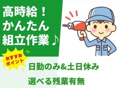 勤務時間 08:30~17:30 (実働7時間45分/休憩75分) ★残業は任意なので無理せず出来ます。 ★希望に応じて残業の調整可能 ※残業なし、もOK! ★組立業務のタイムスケジュール 8:30~ 朝礼 8:40~ 作業スタート! 10:30~ 小休憩。 12:00~ 昼休憩!食堂、車の中等、自由に休憩できます! 12:50~ 休憩終わり。昼からまた頑張りましょう! 13:30~ 昼礼。仕事の状況等を共有します。 15:00~ 午後休憩 17:30~ 退勤!お疲れ様でした!