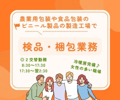 仕事内容 「フィルム製品の加工 工場」での梱包・検品のお仕事 ♪ 工場初心者さんも大歓迎! 先輩がついてイチからちゃんと教えてくれます! 【具体的には】 食品包装用のビニール袋が機械から100枚単位で出てくるので ビニールを揃える!袋に入れる!箱詰めをする! といったような単純もくもく作業です! 〇機械は1人1台 〇配属先によっては座り作業の現場あり 〇職場は20~50代の女性中心で30名くらい在籍中 〇初めは先輩スタッフが付いてくれます♪ 〇仕事はコツをつかめば楽々!もくもく作業が好きな方にマッチします! ※月1~2回の土曜日通常出勤日あり土曜日出勤が難しい場合はご相談ください! ※職場見学時により具体的にご説明いたします!