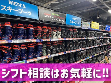 【保険制度】 雇用保険、労災保険、健康保険、厚生年金 待遇・福利厚生 【福利厚生】 ・商品割引制度 ⇒ウインタースポーツ用品をお得にGet♪ ・制服貸与 ・有給休暇 ・時間外手当 ・交通費支給 ⇒公共交通機関利用時/1日上限1000円 ・清潔感があって、お店の雰囲気に合っていれば ネイル、ピアス、髪型髪色は自由です