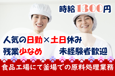 【長期安定】時給1300円!!《食品工場での釜場作業》未経験大歓迎★20代~50代の先輩スタッフ活躍中!人気の日勤&土日休みのお仕事です♪
