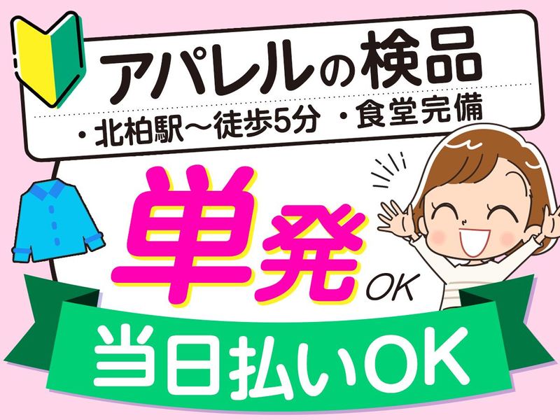 仕事内容 \ 未経験歓迎×カンタン軽作業 / 「北柏駅」から徒歩5分♪ 単発OK!主婦・学生・フリーター活躍中♪ ==================== <オススメ案件> 有名ブランドのアパレル商品を扱う倉庫で、 洋服をたたんだり、袋の入れ替えを行うシンプルなお仕事です! [内容] ■棚から商品を集める ■洋服をたたむ ■袋詰め 初めての方でも安心の簡単作業♪ <おすすめポイント♪>------- ✨空調(冷暖房)完備で快適に働けます ✨難しい作業はありません!未経験大歓迎! ✨職場の居心地の良さが自慢!新人さんからも高評価♪ ------------------ ⭐主婦(夫)活躍中! 扶養内や平日のみもOK! 家庭と両立しながら、無理なく働ける環境です♪ ⭐学生・Wワ―ク大歓迎! 学校帰りや週末だけでもOK♪ 友達との応募も歓迎です! 接客なし&簡単作業なのですぐに覚えられます◎ Wワークにもピッタリ! しっかり稼ぎたい方にもおすすめです! 単発のお仕事を探されている方、 モクモクとお仕事をしたい方♪ お気軽にご応募下さい。 ■■■未経験の方も大歓迎!■■■ 主婦(夫)・学生・フリーターなど 20代~50代迄幅広く活躍中! お友達同士での応募も大歓迎♪ ー ▼働きたい理由は何でもOK! 「急な出費でピンチ・・・」 「家計の足しにもう少し稼ぎたい・・・」 「急にヒマになった・・・」 など ー ★★<WEB面談も可能♪>★★ “来社不要"のWEB面談も選べます! PCやスマホがあれば 家からでも参加可能です♪ ー ★★<お給料がスグGETできる♪>★★ 【日払いOK】(規定あり) 【週払いOK】(金〆切、翌金支払い) 支払方法はその都度変更可能◎ 日払い&現金手渡しOK!! 「急な出費でお財布ピンチ・・・」 「週末に推し活があって・・・」 などなど、日払いOKだからこそ安心! ー ★★<いつでもお仕事探せる♪>★★ 365日稼働なので、 スグに稼ぎたい方にはおススメ! シフト申請はスマホでポチッ!  ̄ ̄ ̄ ̄ ̄ ̄ ̄ ̄ ̄ ̄ ̄ ̄ ̄ ̄ 働きたいなと思ったら・・・ スマホをタッチして予約するだけ! ー <一つでも当てはまったらご応募を♪> □簡単に覚えられる仕事がいい □空き時間だけ働きたい □コツコツ&黙々と働きたい □友達と一緒に働きたい □ちょっとしたお小遣い稼ぎをしたい などご要望は何でもご相談くださいね◎