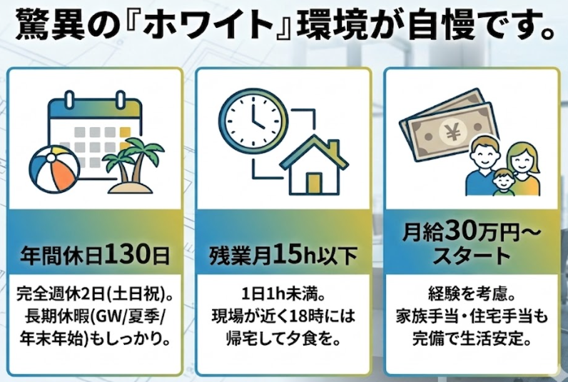 求めている人材 ⭐ 必須条件 ───────────── ✅ 普通自動車免許(AT可) ✅ 建築施工管理の実務経験(年数不問) ⭐ 歓迎条件 ───────────── ✅ 1級・2級建築施工管理技士 ✅ 建築科を卒業された方 ✅ ワークライフバランスを整えたい方 ✅ U・Iターン希望者(転勤なし!)