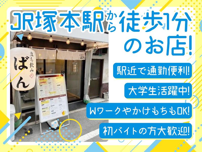 仕事内容 26年新規スタッフ大募集! JR「塚本」駅徒歩1分のお店◎塚本エリアにある人気の立ち飲み屋さんです! インスタもしているので雰囲気は是非チェックしてみてください!「立ち飲みばん 塚本店」で検索してください◎ <今回は、お昼・夕方・週末勤務など幅広く大募集!主婦さんや大学生やフリーターさんが多数活躍中です!> <未経験の方も歓迎!丁寧に教えますよ◎> =================== ホールは、注文を聞いたり、料理を運んだり。キッチンは、簡単な盛付けや調理補助をお願いします。 初めは、オーダーをとったりドリンクを覚えるところからスタート! それができるようになったら、揚げ物などを覚えていきます。 大体1ヵ月あれば全て覚えてもらえると思います。 立ち飲み居酒屋ですが、お酒に詳しくなくても問題ありませんよ! 女性同士や学生のお客様も多く、ワイワイ楽しい雰囲気の居酒屋さんです! =================== <先輩スタッフより> ◎主婦のわたしも活躍中です!お昼もやっているので、ワイワイした雰囲気で働けるここを選びました。 なんといってもシフトの融通がきくから、子どもの学校行事も全部参加できています。 活気のあるお店で働けているから楽しく頑張れています! ◎仕事のおすすめポイントは、 何といってもコミュニケーション能力が上がること! 僕は、就活の時に役に立ちました! 接客には、マニュアル的なものは無いので自分で考える能力が上がります! 立ち飲み屋さんなのでお酒が好きな方やお酒に詳しい人が沢山来られます。 お酒が好き、興味がある方なら知識も増やせますよ! でも何よりも楽しく働ける職場です! 楽しく働きたい、バイトを通して成長したい方は是非! =================== ランチは、主婦さんやWワーク・かけもちのスタッフが活躍中です! 夕方は、現在学生さんやWワーク、フリーターさんが活躍中! =================== アットホームな雰囲気で楽しくお仕事できます! お仕事は少しずつ覚えていけば大丈夫なので、未経験や初バイトさんも大歓迎です! 仕事中も不明な点があれば何でも聞いて下さい! JR「塚本」駅から歩いて1分で、駅チカだから通勤も便利です! シフトは柔軟に調整していく予定です! テストや家庭の用事、プライベートなど予定が立てやすい!
