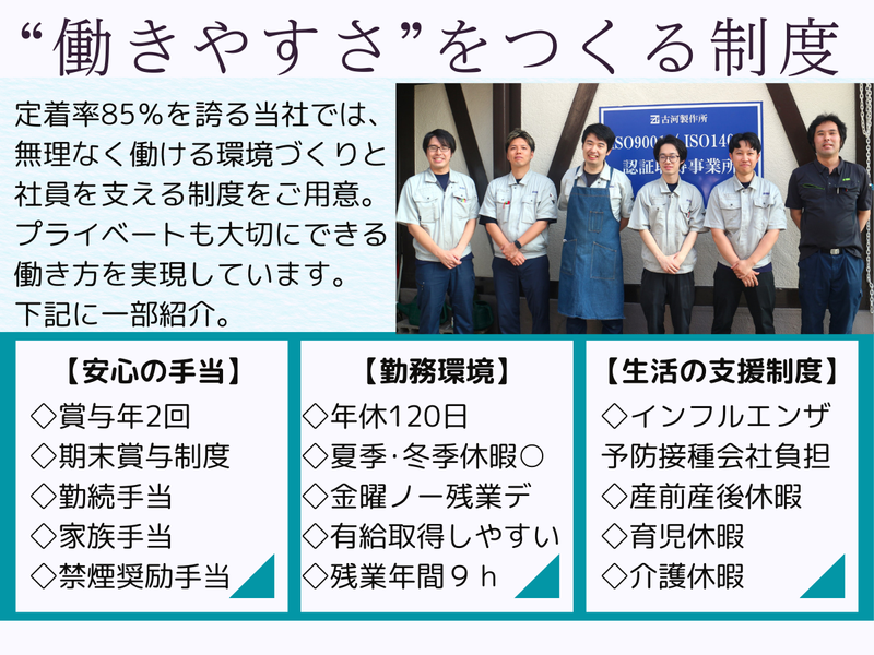 仕事内容 \40歳未満×未経験から“品質のプロ”へ/ 20〜30代のスタッフ活躍中! 土日休み × 年休120日以上 × 残業ほぼ”0”の安定環境 創業60年以上の安定企業で、 ワークライフバランスを大切にしながら、 ゼロから成長できる環境です。 ✨【この求人のポイント!】✨ ――――――――――――――――――― ◆ 年休120日/自分の時間も確保 ◆ 定着率85%以上 → 長く働ける環境 ◆ 残業ほぼなし(昨年度は年間9時間程度) ◆ 金曜はノー残業デー/プライベート充実 ◆ 昇給・賞与あり+家族手当など待遇充実 ◆ 3か月のOJT研修+マニュアル完備 ◆ 家庭都合の急な休みもチームでフォロー! ✅仕事内容 ――――――――――――――――――― 自動車部品など、生活に欠かせない製品をつくる 精密部品メーカーでの”品質保証”の仕事です。 <品質保証とは?> 完成した製品に”キズや不具合がないか”、 ”安心して使える状態か”を確認する仕事です。 <当社の品質保証の進め方> 当社では、製品の測定・チェックを行い、 問題があった場合は以下の流れで対応します。 ・「どこで・何が起きたのか」を整理 ・先輩や現場スタッフに共有 ・なぜ起きたのかを現場と一緒に確認 ・同じ不良が起きにくくするための対策を検討 チェックだけで終わらず、 現場と相談しながら改善にも関われる仕事です。 ✅未経験の方でも安心してスタート可能! ――――――――――――――――――― ✨最初は簡単な「製品チェック」から✨ 先輩と一緒にOJTで進めるため、専門知識や経験は不要です。 【STEP1:入社後まずやること】 ◆ 製品チェック・確認業務 ・先輩と一緒に製品を見てチェック ・測定器を使ってサイズを確認 ・気づいた点をチームに共有 → まずは「確認」「記録」が中心。 製品を知るところから始めます。 【STEP2:慣れてきたら】 ・「どうすれば不良が起きにくいか」を 先輩や現場と一緒に考えます ・できる範囲から改善に取り組みます → 日々の気づきを活かせる仕事です。 【STEP3:経験を積んでから】 ◆ 品質ルールの確認・サポート ・決められた手順通りに進んでいるか確認 ・書類チェックや報告などの補助業務 → 最初は補助業務が中心。分からないことはすぐ相談可能。 【将来的には】 ◆ 品質保証体制の見直しにも参加 ・再発防止の取り組みサポート ・品質を保つためのルールや流れの見直し ・製造・設計部門と連携した改善活動 → 経験を積んだ後に関わる業務です。 最初から任せることはありません。 ✨将来的に仕組みづくりにも関われます✨ ✅当社について ――――――――――――――――――― ◇創業60年以上の安定企業◇ 1961年設立の精密加工部品メーカー。 東京の「町屋」と埼玉の「八潮」に拠点を構え、 自動車・金融機器・飲料機器など、 日常生活を支える幅広い部品を手がけています。 ◇最新設備と清潔な工場◇ 多数のNC旋盤・マシニングセンタを保有。 クリーンな作業環境や自動搬送機を整え、 ISO9001・ISO14001を取得するなど、 安心して働ける職場環境が整っています。