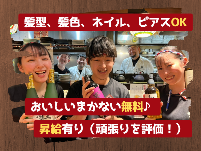【保険制度】 雇用保険、労災保険、健康保険、厚生年金 待遇・福利厚生 【福利厚生】 ◇社会保険制度あり(法定通り) ◇交通費規定支給 ◇車通勤OK、バイク通勤OK ◇Tシャツ貸与 ◇昇給あり ◇まかない無料 ◇正社員登用制度あり ◇独立支援制度あり ◇ネイル・ピアスOK ◇髪型・髪色自由 ◇即日勤務OK ◇友達同士の応募OK