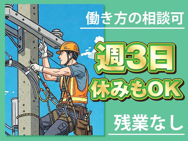 仕事内容 ✨通信インフラのスペシャリストへ!✨ 未経験入社でも、独り立ち出来れば月給30万円以上が可能! 入社直後の研修期間は「技術研修生」として学んでいただきますが、 給与もきちんとお渡しします。(研修期間は日給制※日給9808円) 学校の勉強が得意か不得意はこの仕事には関係ありません。 まず必要なのは、学力ではなく「見て、やって、覚える」好奇心。 一度身につければ、どこの現場でも重宝される「通信インフラ」の特殊技術。 未経験からの数か月が、あなたの人生を安定させます。 業界未経験の方はもちろん、社会人デビューという方もご安心ください。 ゼロからのスタートを応援します! ______________________________________________ 【仕事内容】 ◆光回線(FTTH)の通信作業工事 FTTHとは:Fiber To The Homeの略で、通信回線を屋内へ引き込むこと。 簡単に説明すると、有線を家まで引っ張って安定してインターネットを使える環境を整える作業です。 <具体的な仕事の流れ> [1]FTTHご契約者様宅(一軒家やマンション)へ伺います。 [2]機械を部屋のどこに設置するかを決める [3]電柱に登り、有線を室内に引き込む [4]ネット回線を繋いだら作業完了! 【具体的な仕事内容】 ✅屋外作業…電柱から電柱、電柱からお客様宅への配線作業 ✅屋内作業…電柱からお客様宅の室内まで配線接続や設置(高所作業) 電柱にLANケーブルの配線を設置し、オフィスや住宅へのインターネット等の通信環境を新設していきます。 ■現場は調布市、府中市、世田谷区、練馬区、渋谷区、新宿区などに多数あり! ■取引先は誰もが知っている大手メイン ■社用車(軽自動車)の貸与あり ■現場への直行直帰も可能 ■1日の担当件数を終えたら直帰OK 他、作業報告書の記入はありますが、 その日の作業内容をまとめるだけ! 手書きでOKなのでPCスキルは必要ありません。 ______________________________________________ ✅入社後について 一人前になるまでの期間は、会社からあなたへの「先行投資」です。焦らず技術を吸収してください。 私たちの仕事は「体を動かせばいい」「ものをはこべばいい」というものではありません。 「技術を習得」して1人前。 通信インフラを支える、専門学校でも学べない技術です。 未経験からの数か月で身に着ける技術が、あなたの人生を安定させます。 ✅一通り覚えられるまでの期間 期間中は「技術研修生」として先輩に同行します。 大体2、3ヶ月で一通りの仕事は覚えられますし、一人前になるまでフォローしますのでご安心ください。 時間をかけてじっくり覚えて下さい。 作業着など身の回りのモノは全て用意してお待ちしています。 ✅研修の流れ※一例 (技術の熟練度によって期間は変わります) ◆1ヶ月目 お客様対応や室内作業のノウハウ、工事の流れを学びます。 ↓ ◆2ヶ月目 電柱に登る作業もスタート。慣れるまで高所作業で怖いと思うかもしれませんが、大体2~3週間で慣れてきます。 ↓ ◆3~4ヶ月目 配線を繋ぐ作業開始。パターンがあるので繰り返す内に覚えますよ。 ↓ ◆5~6ヶ月目 仕上げ期間。独り立ちするまでの不安点を一つずつ解消していきます。 ↓ ◆7ヶ月以降 独り立ちしますが、フォロー体制は万全。 もしもの時は、近くの現場で作業している先輩が応援にきてくれますよ。 ______________________________________________ \入社時期の相談もOK!/ 「今すぐ入社したい」方はもちろん、現在在職中の方や来年3月に卒業予定の方も大歓迎です。 「〇月から入社したい」など、ご相談ください。 \定着率も高く、居心地◎/ 10年・20年以上と長く勤めている先輩も多い当社。 安定性と働きやすさより定着率は高めです。 昨年末には、28歳の若手スタッフが入社しました。 インターネットがある限りなくならない通信作業工事のお仕事だから、安定性は抜群! 残業もほぼないため、プライベートも充実できます! \資格取得を応援します/ 技術を教えることはもちろん、業務に関わる資格取得もサポートします。 資格取得に必要な受験費用は全額会社が負担! 国家資格の取得も可能ですので、一生モノのスキルを手に入れたい方にもピッタリです。