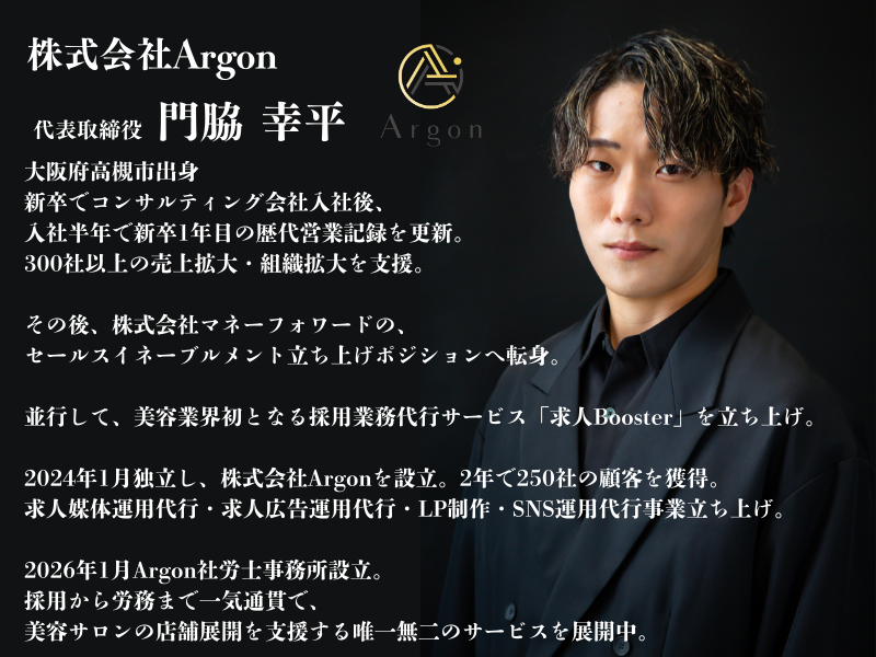 仕事内容: 【株式会社Argonについて】 人材業界の店舗ビジネス領域で、業界No,1を目指す。 一般的にホワイトカラーと言われる職種であるオフィスワーカー(エンジニア・営業・経理など)の採用活動に対する採用支援サービスは世の中にたくさんありますが、 店舗事業と言われる美容サロン・鍼灸整骨院・歯科医院などの、専門的なスキルを要する職種の採用のための、支援サービスはまだまだ未発達の状態です。 「店舗事業の求人といえば、株式会社Argon」と言われるサービス・会社を作っていきます。 これからAIの発達により、ホワイトカラーの事務系の仕事はどんどんなくなっていきます。 そのタイミングで、求人の受け入れが可能なのは、 人が対応する美容業界です。これからさらに美容業界の求人は伸びていく余地があります。 現在、 美容業界特化で採用の支援をしており、 全国500店舗以上の、美容室・ネイルサロン・アイサロン・エステサロンの採用の支援を行っております。 【メイン業務】 制作チーム(デザイナー・動画編集者)と運用チーム(オペレーター)を指揮し、クライアントの課題解決を最前線でリードする「 マーケター」のポジションです。 【具体的な業務内容】 Web制作(LP)、求人媒体運用、SNS運用、広告運用など、多岐にわたるプロジェクトの進行管理をお任せします。 ◎クライアント対応(CSS) ・新規ご契約後のキックオフミーティング(Zoom)の実施 ・チャットツール(LINE)での日々の顧客対応・相談対応 ・修正依頼のヒアリングと要件定義 ◎制作・運用のディレクション ・社内のデザイナー、ライター、運用スタッフへの指示出し ・納品物のクオリティチェック(誤字脱字、デザイン崩れの確認) ・スケジュール管理(納期管理) ◎実務サポート(プレイング業務) ・Web広告(Meta)の初期設定・入稿作業 ・数値レポートの作成 ・求人媒体運用 【入社後の流れ】 ①最初の1ヶ月: 代表の商談やMTGに同席し、Argonのサービス内容と顧客対応の「型」をインプット。既存顧客の引き継ぎを受けます。 ②2〜3ヶ月目: 制作・運用チームへの指示出しをメイン担当として行い、代表の仕事を巻き取りながら、一緒にさらにブラッシュアップしていきます。同席してもらいながら、自分で顧客のサポートができるようになるよう、学んでいただきます。 ③4ヶ月目以降:独り立ち 【代表メッセージ】 初めまして! 株式会社Argon 代表の門脇です。 日本の23〜65歳の非労働者は約2000万人と言われています。 素晴らしいスキルを持っているのに、家庭の事情や体調の影響で、 本来の能力が発揮されない環境で働いている方や、 そもそも働ける環境がない方がたくさんいらっしゃいます。 これだけ人手不足と言われている中で、 日本にはまだ約2000万人もの人的リソースがあるのです。 様々な事情がある方でも、能力を活かして、 好きな時に好きな場所で働き、報酬が得られる環境を作っていきたい。 そういった方達と、力を合わせて、お客様に貢献していきます。 また、社員は現場でせっせと働き、社長だけが自由なところで自由に働いている。 そんな会社がたくさんあり、なぜ社員は自由な場所で働いてはいけないのか? と、ずっと疑問に思っていました。 社長も社員も関係なく、好きな時に好きな場所で、 能力を活かして働ける環境を作っていきたい。 「社会を変える」ほどの大きな志は持てませんが、 自分の関わる半径3m以内にいる家族・自社の社員には、 そのような環境を提供し、幸せに生きてもらうための、貢献ができたらと思っています。 そのための基盤を作る創業期。熱を込めて良いサービスを作る、良い会社を作る。ことを共に楽しめるメンバーと働きたいです。