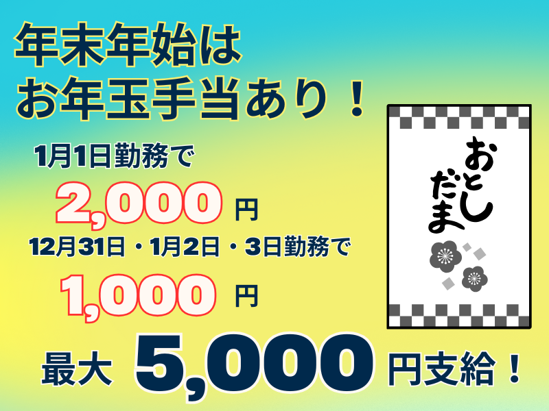 時給1,340円以上 給与詳細 基本給:時給 1340円 〜 *昇給あり *ミニボーナスあり *交通費規定支給(上限月5万円まで) 自転車通勤OK! 《様々なインセンティブ》 *稼働率手当(インセンティブ) *GW手当・繁忙期手当などあり ※規定あり \12/31~1/3は年末年始手当あり!/ 出勤するたびに手当を支給します♪ *1/1→1日あたり2000円 *12/31・1/2・1/3→1日あたり1000円 全日程出勤したら合計5000円のプラスに♪ 【給与例】 給与例 <月収例|週5日勤務の場合> 時給1340円×5時間勤務=1日あたり6700円 ▶ 月収:13万4000円+交通費 この収入の他に ”インセンティブ”や”ミニボーナス”がつきます。 \社会保険に加入して働きたい方にもぴったりです/
