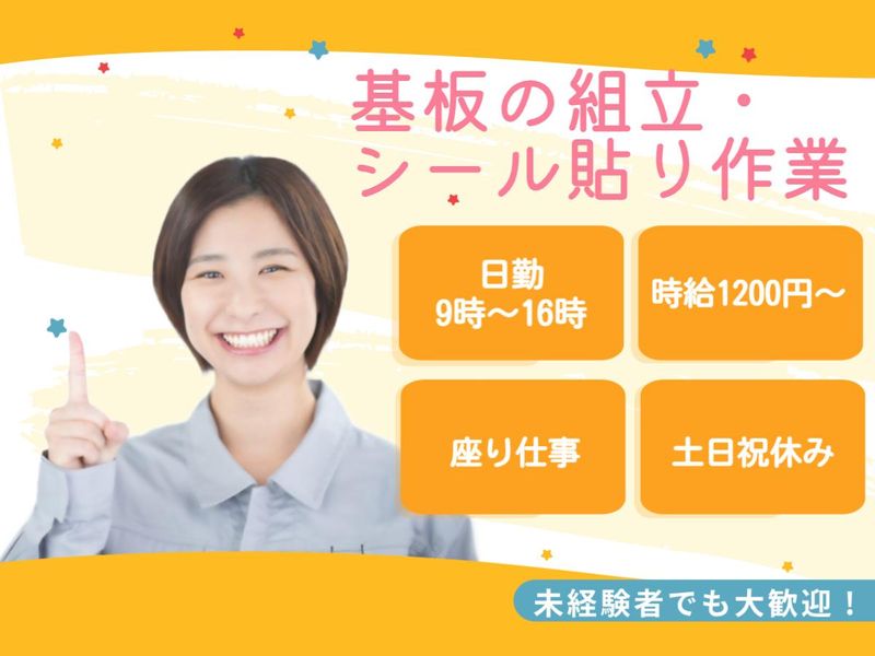 仕事内容 ▼遊戯機基板の組立ラインで、部品挿しやシール貼り 2026年2月5日現在、業務多忙につき、引き続き募集を継続しております。 作業は座り作業か立ち作業か、選ぶことができますよ! 「難しそう…」と思うかもしれませんが、ご安心ください! 先輩スタッフが丁寧にイチから教えるので、未経験の方も安心してスタートできます。 9時出勤なので、お子さんを送り出してからゆっくり出勤できますよ! もちろん、勤務時間のご相談も可能です。 土日祝はしっかりお休みなので、プライベートも充実できます! 長期で安定して働ける可能性が高いです。 働く前に職場の雰囲気を知りたい方は、事前に職場見学もできますのでご安心くださいね! ☆ここが嬉しいポイント!☆ ・未経験者大歓迎! ・9時出勤! お子さんの送り迎えもスムーズ ・土日祝休み ・週払いも可能!(当社規定あり) 急な出費にも対応 ・事前に職場見学OK! 働く前に職場の雰囲気を知れて安心 ・長期で働ける可能性大! 安定したお仕事をお探しの方に