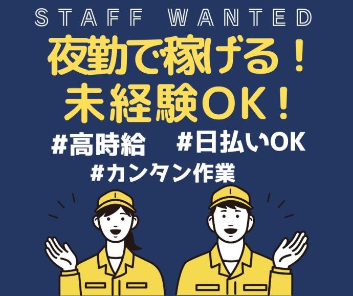 仕事内容 \*夜勤作業で効率よく高収入GET*/ 【仕事内容】 チルド内での仕分け作業になります! 【仕事・職場の特徴】 ・未経験の方でもすぐに慣れて頂けるカンタンなお仕事です。 ・わからない事は丁寧に教えてもらえます♪ ・40代までの男性スタッフ活躍中!