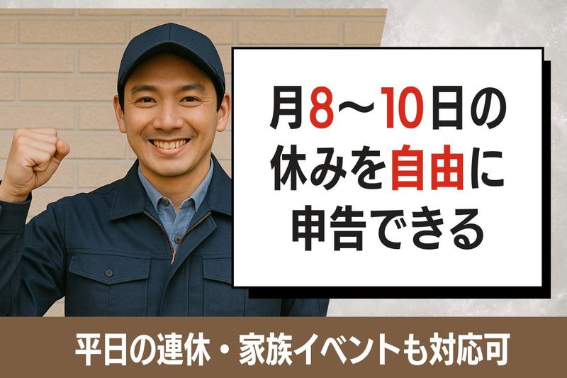 休日休暇 ◆月休日は8~10日あります。 その中で土日を含めて ご自身で休日にすることも可能です。 ※年末年始は当番制 (ご希望をお伺いします) ◆有給休暇(入社半年後10日付与) 【年間休日115日】 ========== 当社の大きな魅力は 「お休みの取り方が自由」 なこと。 月8~10日の休みを、 自分の予定やライフスタイルに合わせて 申告制で取得OK! 「平日に連休をとって旅行へ」 「家族の予定にあわせて日曜休み」 など、柔軟にスケジュールが組めます。
