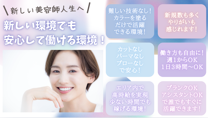 仕事内容 当店はカラー施術に特化した専門店です。 複雑なカット技術や、流行のパーマ、仕上げのブロー技術は一切不要! 「美容師免許を活かしたいけど、技術に自信がない」 そんなあなたが、一番無理なく、一番輝ける働き方をご用意しました! 【主な施術内容】 ・カラー塗布(ワンタッチ/ツータッチなど) ・シャンプー ・カウンセリング(色味の提案・希望の確認など) ※カット、パーマ業務は一切ありません。 ※最後はお客様自身で乾かしていただく「セルフブロー方式」です。 ※ブローやセットの技術が不要なので、仕上げのプレッシャーもありません。 【働きやすい理由がたくさん!】 1. 技術負担が少ないから、ブランクがあっても安心 「しばらく美容から離れていた…」 「カットが苦手で不安…」 ここはカラー専門店。最新のカット技術も、映えるスタイリング技術も勉強しなくて大丈夫。 まずは簡単なリタッチ(根元染め)の塗布から、あなたのペースで始めていきましょう。 2. カラーが上手くなるスピードが早い 毎日カラーのお客様が多数来店! だから、自然とカラー技術が磨かれ、 「塗布が速くなる・ムラが少なくなる・色味提案が上手くなる」 とスキルアップに直結します 3. シフト柔軟/家庭やプライベートと両立しやすい ・週1〜OK ・1日4h〜OK ・扶養内もOK など、ライフスタイルに合わせて働けます 「子供が学校に行っている間だけ」 「掛け持ちの仕事の合間に」 など、あなたの生活リズムを崩さずにシフトが組めます。急なお休み相談もお互い様で助け合っています。 4. 施術も環境も “ストレスフリー” ・流れ作業じゃなく、丁寧にカラーを届けられる ・人間関係が良いから安心して働ける ・メニューがシンプルだから覚えることが少ない お客様一人ひとりに丁寧に接することができるため、「ありがとう」の言葉がダイレクトに届く、やりがいのある環境です。 “美容師を続けたいけど、負担は減らしたい そんな希望が叶う場所です!