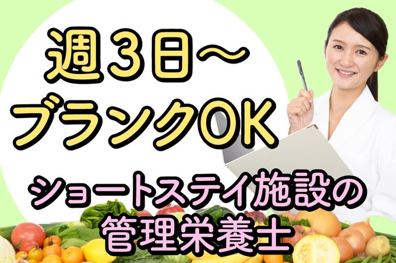 【アピールポイント】 【ショートステイ施設にて管理栄養士募集中】 資格を活かして、スキマ時間に働きませんか ✅週3日~勤務でOK ✅勤務時間の調整可能 ✅ブランクOK!サポート体制充実 【お電話でのご応募もお待ちしております】 TEL:080-4635-8564