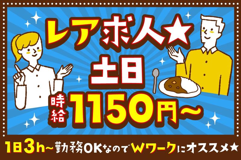 求めている人材 \\ 未経験大歓迎!// 知識・資格も一切不問です◎ 笑顔でお店に立てればOK! ★土日メイン勤務できる方優遇★ 「土日だけ」の週2日もOKです。 学生さん・主婦(夫)さん・ Wワーカーさん・フリーターさん… みなさん歓迎! *初飲食業や初バイトの方歓迎 *ブランク明けや久々の職場復帰の方歓迎 *20~40代の男女活躍中 【 こんな方が活躍中 】 ・主婦(夫)さん 平日のランチタイムに勤務。 家庭と両立して扶養内で 働いています。 ・高校生や大学生 学校が休みの土日メイン! 昼から出勤してガッツリ稼いでいます。 ・家から自転車で通えるから… ・通学路の途中だったから… ・カレーを社割で安く食べたいから… ・プライベートを優先しつつ 週2日や週3日働きたいから… など志望理由は人それぞれです☆ まずは面接で希望のシフトを 教えてください♪ わからないことや不安なことがあれば 事前のお電話で質問も受け付けますので お気軽にご連絡くださいね!