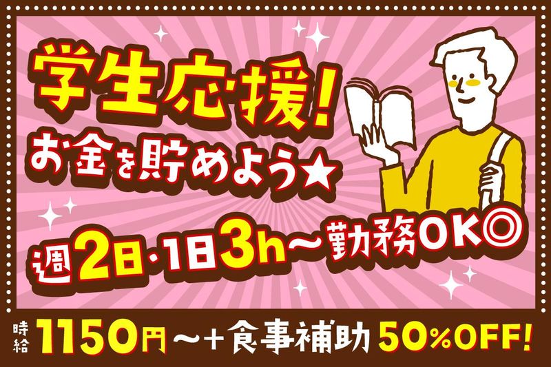 仕事内容 …………………………………………… こ の 求 人 の ポ イ ン ト …………………………………………… ◆未経験大歓迎!イチから業務を教えます ◆週2日・1日3h~勤務OK ◆土日は時給アップでモチベもアップ ◆「土日だけ」働きたい方も歓迎 ◆学生さん・主婦(夫)さん活躍中 ◆学業や家庭との両立を全力応援 ◆掛け持ち・Wワーク・扶養内勤務も可 ◆半額で食べられる!食事補助あり …………………………………………… お 仕 事 内 容 …………………………………………… カレーハウスCoCo壱番屋の スタッフとして下記をお任せします★ ◆接客・レジ対応 ◆片付け ◆簡単な料理の盛り付け ◆料理提供 言葉遣いなどを含め、 一つひとつ丁寧にレクチャーします。 業務はどれもシンプルで覚えやすいです! また、材料は仕込み済みのものが届くので 温めやカットなど、調理も簡単です! …………………………………………… メ リ ッ ト い っ ぱ い …………………………………………… 【 土日は時給50円アップ 】 同じ実働時間でも平日より稼げるため 「効率的に稼ぎたい」という方は 土日メイン勤務がオススメ! また、「平日は別の仕事がある」 「学校が休みの日だけ働きたい」 という方は、土日だけの 週2日勤務も大歓迎です◎ 【 食事補助あり!嬉しい「半額」】 スタッフから大好評の食事補助制度。 なんと全メニュー50%オフ♪ ハンバーグやとんかつなど、 トッピングももちろんOK! 浮いた分の食費は趣味に充てるなど、 有効活用してくださいね! 【 未経験でも安心スタート可 】 初心者さんの育成実績は豊富ですので 未経験の方も安心してご応募ください。 笑顔で対応できればOKです! 初めてのアルバイトという方も歓迎します! 【 フレキシブルに働けます 】 <週2日~・1日3h~OK>と 誰もが働きやすいシフト制です。 学生さんも主婦(夫)さんも フリーターさんも大歓迎! 学業や家事、本業などと 無理なく両立出来ますよ♪