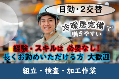 シフト制 勤務時間 (1)8:10~17:00 (2)20:00~4:45 配属部署により日勤もしくは2交替 【休憩時間】60分 【残業】有り(月20~40h程度)
