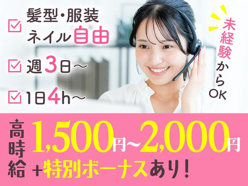 仕事内容 ◇◆◇オープニングメンバー大募集◇◆◇ **……………………………………………… 家庭やプライベートの時間も大切にできる、 稼げる『コールセンター』バイトに挑戦♪ ………………………………………………** \ この求人のPOINT! / ✨マニュアル完備で未経験さんも安心! ✨1日4h~&週3日~OKの柔軟シフト制! ✨頑張った分稼げる"特別ボーナス"あり! ✨我慢せずにオシャレも楽しめる環境! **……………………………………………… 《詳しいお仕事内容》 あなたにお任せするのは用意されたマニュアルに沿って、お客様にお電話で商品をご案内するコールセンターのお仕事。 興味を持っていただけたお客様には「後日詳しい説明を聞いてみませんか?」と約束をし、営業メンバーにバトンタッチ! お客様と営業をつなぐ役割りだけを担当するため、知識ゼロでスタート可能です♪ ………………………………………………** \ POINTを詳しくご紹介! / ✨あなたの"理想の働き方"を実現できる!  ̄V ̄ ̄ 「子どもが学校に行っている間に働きたい」 「扶養の範囲内でコツコツバイトしたい」 「週3以上シフトに入って稼ぎたい」 そんな想いを持った方にも応えられるのが当社のアルバイト! シフト自由&柔軟に調整OKなのであなたのライフスタイルに合わせて、コツコツorシッカリな働き方を叶えてくださいね♪ ✨アルバイトなのに"高収入"を目指せる!  ̄V ̄ ̄ 未経験でも1,500円スタートの高時給に加え、お客様のアポイント獲得数に応じてインセンティブを支給! 成果を出せば出すほど稼げる仕組みのため、効率よく高収入が狙えます★ フルタイム週3日以上~など、働き方によっては"月収50万円"も目指せるレアバイトです! ✨個性も大事に"自分らしく"働ける環境!  ̄V ̄ ̄ 髪色や服装の指定はございませんので、あなたのお好きなスタイルで勤務可能◎ もちろんネイルやピアス、ヒゲについても自由にしていただけるため、あなたらしさを我慢することなく働いていただけます♪ **……………………………………………… 当社のお仕事は家事や、育児と両立しながら働きたい主婦(夫)さんも、安定してシフトに入ってしっかり稼ぎたいフリーターさんにもピッタリ! 「自分にもできそうかも」と感じたら、まずは気軽にご応募ください♪