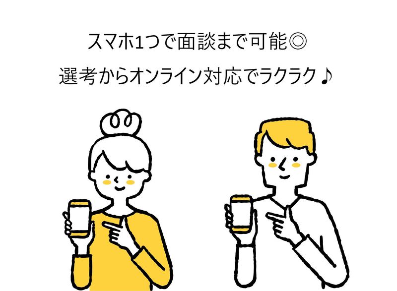 選考プロセス 履歴書・来社不要! ビデオ面談後に担当営業と同行して職場見学を行います。 【登録地】 リモート面談 担当者:面談担当 来社不要! ビデオ面談orご自宅近くで現地面談
