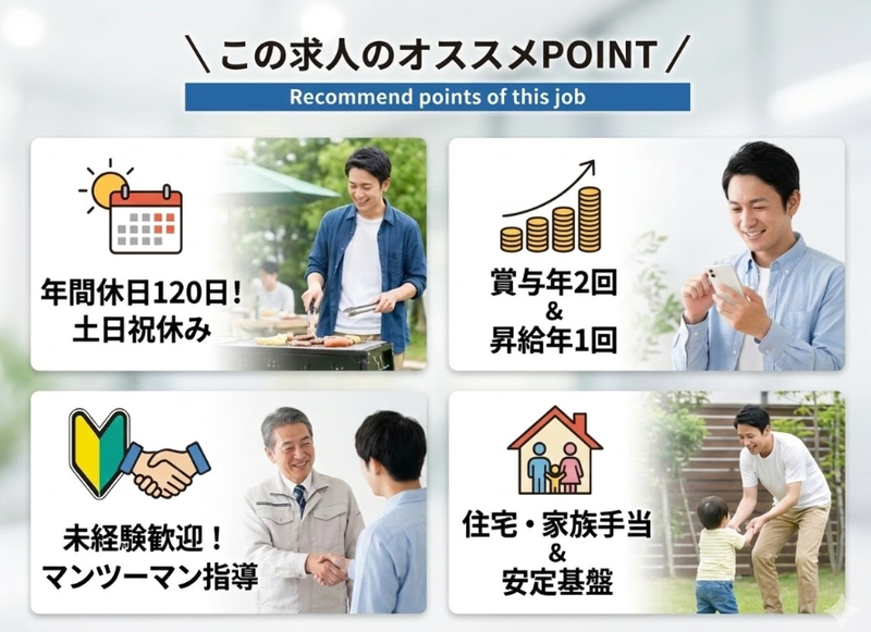求めている人材 ⭐ 必須条件 ───────────── 高卒以上 基本的なPC操作ができる方(Word・Excelの文字入力レベルでOK) 40歳以下の方(長期キャリア形成のため) ⭐ 歓迎条件 ───────────── 未経験者・第二新卒歓迎(フリーターからの正社員デビューも応援!) 営業や接客、販売など、人と話す仕事の経験がある方 普通自動車免許をお持ちの方(尚可) ⭐ 求める人物像 ────────────── デスクワークだけでなく、人とコミュニケーションを取るのが好きな方 チームワークを大切にし、周囲と協力して仕事を進められる方 変化のある環境を楽しめる方 安定した環境で長く腰を据えて働きたい方 (※男性活躍中の職場ですが、性別問わずアクティブに動ける方を歓迎します) 年齢の条件と理由:あり(例外事由3号のイ・40歳未満(長期勤続によるキャリア形成のため))