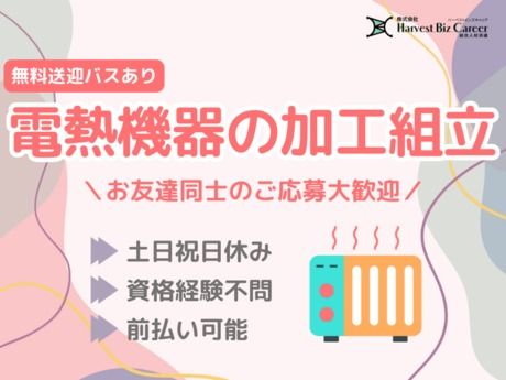 仕事内容 具体的には 産業用ヒーター・加熱装置等の 熱エネルギー変換機器の開発・製造会社にて 製造スタッフの追加募集! 工場内にて電気部品の 【加工・組立作業】をお願いいたします。 未経験でも慣れるまでしっかりフォローします★ < 未経験の方も大歓迎◎ > まずはご応募、お問い合わせください! 「新しい環境でのお仕事は不安…。」 「製造経験はあるけど異なる業界では初めて…」 などなど、心配する必要はありません!! 入社後に1~2ヶ月の研修がある他 社員の方や周りの方が優しくフォロー してくれるので、安心して挑戦できます♪ <*事前の工場見学も可能!*> その場の環境や雰囲気を見られるので 安心してスタートできます*
