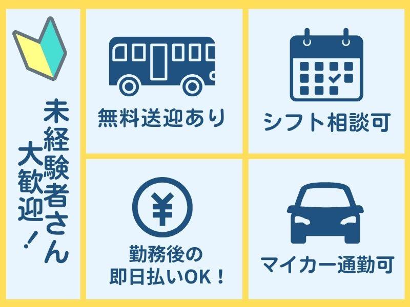 アピールポイント: ◇埼玉県狭山市広瀬台◇ ☆日払い対応可能! ☆即日払いあり!現金でお渡しOK! ☆1月中旬からスタート!開始日に相談OK! ☆未経験OK♪丁寧な研修あり♪ ☆幅広い世代のスタッフが活躍中♪ ☆シフト相談OK ☆無料送迎バスあり!通勤ラクラク! ☆冷暖房完備の快適空間♪ ☆無料のウォーターサーバーあり ☆コンビニ・食堂あり!