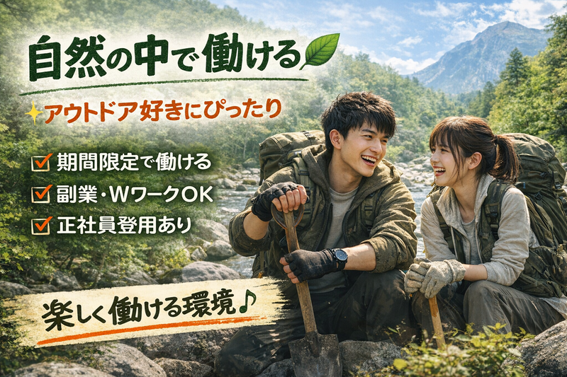 求めている人材 【応募資格】 ・学歴・経験不問 ・普通自動車免許(AT限定可)必須 ・屋外作業に抵抗がない方 ・安全意識を持って行動できる方 ・アウトドアが好きな方 ※アウトドア・インストラクター経験者は優遇