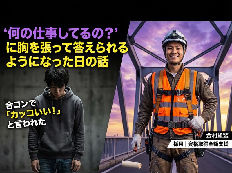 仕事内容 「将来が見えない」 3年付き合った彼女に、 そう言われた。 駅前のファミレスで。 パフェを食べながら。 「蓮くんのこと嫌いになったわけじゃない。 でも、このまま付き合い続けても 結婚とか想像できない」 「……なんで?」 「だって、正社員じゃないじゃん。 社保もないし、ボーナスもないし。 友達の彼氏はみんな正社員だよ。 親にも紹介できないし」 何も言い返せなかった。 全部、事実だったから。 24歳。 居酒屋のバイト。 月収18万。手取り15万。 社保なし。 「将来が見えない」。 その通りだった。 ■ 振られた夜 家に帰って、 ベッドに倒れ込んだ。 天井を見ながら考えた。 彼女が悪いのか? いや、違う。 俺が悪い。 3年間、 「いつか正社員になるから」と 言い続けて、 何も変わらなかった。 「いつか」は来なかった。 彼女は3年間待ってくれた。 3年間、 手取り15万の俺の横にいてくれた。 それなのに、 俺は何も変えなかった。 「俺、クソだな」 涙は出なかった。 悔しすぎて出なかった。 ■ 翌朝、スマホを開いた 求人アプリを開いた。 今まで何度も開いて、 何度も閉じてきたアプリ。 「どうせ俺なんか」と 思って閉じてきた。 でもあの夜は違った。 「もう二度と、 『将来が見えない』とは 言わせない」 検索ワード: 「正社員」「未経験OK」 「学歴不問」「大阪」 金村塗装の求人が出てきた。 「橋や歩道橋・高速道路の 公共物塗装スタッフ」 月給23万〜。 社会保険完備。 土日祝休み。 年間休日120日以上。 未経験OK。 月給23万。 今の18万より5万多い。 社会保険完備。 彼女に「社保もないし」と 言われた俺が、 社保に入れる。 即日応募した。 振られた翌日だった。 ■ 面接 Zoomで15分。 37歳の社長が聞いてきた。 「なぜこの仕事を?」 正直に言った。 「昨日、彼女に振られました。 『将来が見えない』と。 悔しいけど、その通りだと思いました。 本気で変わりたいんです」 社長は少し笑って言った。 「正直だね。 うちは本気で変わりたい人を 待ってる。一緒にやろう」 ■ 入社して変わったこと 7人のチーム。 橋の錆をケレンハンマーで落とす。 下地処理をする。 防錆塗料を塗る。 最初は何もわからなかった。 でも先輩が 「なぜこの塗料を使うか」 「なぜこの手順なのか」 全部教えてくれた。 居酒屋では 「皿洗っといて」しか 言われなかった。 ここでは「なぜ」を教えてくれる。 1ヶ月目。 初めて歩道橋の上で塗装した。 自分が毎日通ってた歩道橋を、 自分の手で塗り替えている。 不思議な気持ちだった。 3ヶ月目。 下地処理から仕上げまで 一通りできるようになった。 先輩に 「もう一人でいけるな」 と言われた。 居酒屋で3年間、 「使えない」と思われてた俺が、 3ヶ月で「一人でいける」と 言われた。 ■ 1日の流れ 8:00 今日の現場と作業内容の確認 作業開始 9:00 KY活動(危険予知)。 全員で安全確認してから作業開始 9:15 安全帯装着、作業開始 9:30 ケレン作業(錆落とし・旧塗膜除去) 12:00 昼休憩(弁当) 13:00 午後の作業開始。下塗り塗布 15:00 小休憩 15:15 引き継ぎ下塗り作業 16:30 作業終了。道具の片付け・清掃 17:00営業所に戻って終業 17時に帰る。 土日祝は休み。 居酒屋の頃は 金土日が出勤で、 彼女と休みが合わなかった。 今は土日に 好きなことができる。 ■ 半年後の給料明細 手取り19万を超えていた。 居酒屋の15万から4万増えた。 賞与も出た。 生まれて初めてのボーナス。 「賞与」という文字を 給料明細で見た時、 手が震えた。 居酒屋にボーナスなんかなかった。 ■ 「何の仕事してるの?」 入社8ヶ月目。 合コンに誘われた。 振られてから初めて。 「何の仕事してるの?」 来た。この質問。 以前なら 「居酒屋のバイトです……」 と小さく答えてた。 今は違う。 「橋や高速道路の塗装をしています。 公共インフラの防錆塗装です」 「え、すごい! 橋とか塗るの?」 「はい。歩道橋とか高速道路とか、 錆を落として塗り替える仕事です」 「カッコいい!」 「カッコいい」。 居酒屋のバイトで 「カッコいい」と言われたことは 一度もなかった。 ■ 元カノのことは 正直に言う。 元カノを見返したいと思って 転職した部分はある。 でも今は、 見返すとかどうでもよくなった。 俺が変われたのは、 元カノに振られたからだ。 あの「将来が見えない」がなかったら、 俺は今でも居酒屋で 皿を洗ってたかもしれない。 だから、恨んでない。 むしろ感謝してる。 あの一言が、 俺の人生を変えてくれた。 ■ 1年後の今 年収は420万が見えてきた。 居酒屋の頃の倍近い。 技術が上がれば、 2年目で600万も現実的だと 社長が言ってた。 社会保険にも入った。 土日祝は休み。 賞与は年2回。 次に付き合う人には、 「将来が見えない」とは 絶対に言わせない。 俺はもう、 「何の仕事してるの?」に 胸を張って答えられる男だ。 ■ 同じ経験をした奴へ 振られた直後は辛い。 俺もそうだった。 でも、 振られた痛みは 最強の行動トリガーだ。 「悔しい」 「見返したい」 「変わりた