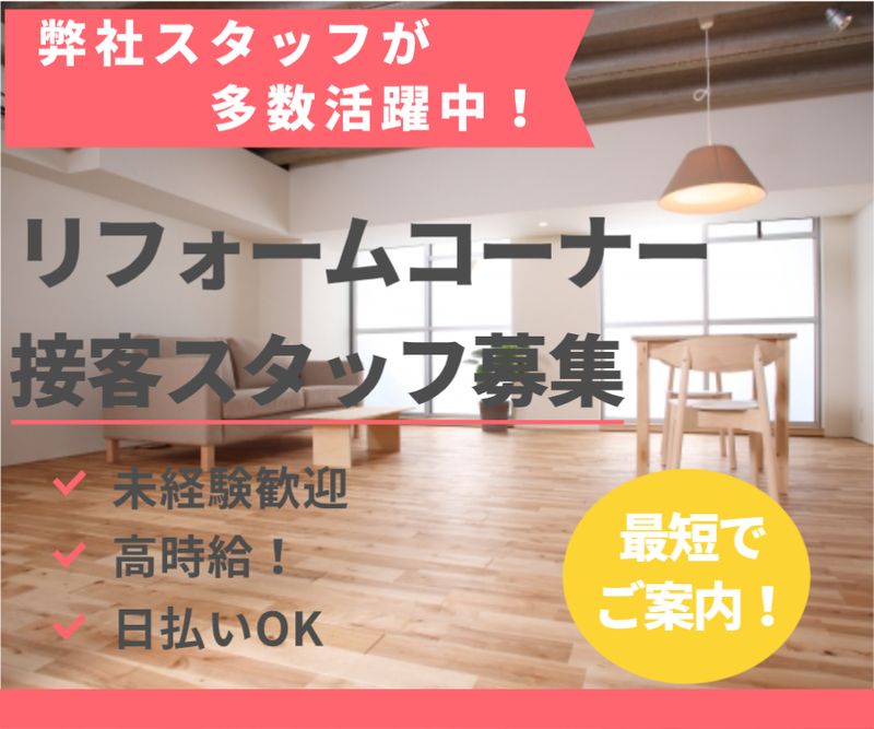 仕事内容 【お仕事point!!】 1.大手優良企業で長期で働くチャンス♪ 2.高時給+交通費全額 3.お客様とお話しするダケ! ≪働くメリット♪≫ (1)満足度アップの月給26万円以上+交通費支給! 毎日通う会社だから大事なポイント!車通勤される方は、ガソリン代支給! (2)ライフスタイルにあわせて土日祝日関係なく働きたい時に働く! 年間で安定した収入を確保できます!休みたい時に希望休を提出するだけ! 柔軟に対応できるのがシフト制の魅力!幅広い年代の方から選ばれています♪ (3)残業なし「趣味の時間」「家庭との両立」がしっかり確保できるのでワークバランス良好♪ 幅広い年代の方が活躍中!弊社スタッフの他店舗で長期で在籍されています! (4)車・バイク・自転車など好きな交通手段で相談OK!「電車・バスの時間」「雨の日」「荷物が多い日」でも気にせず通勤ができるのは嬉しいポイント♪ - \呼び込み・ノルマなし!未経験で高時給×高待遇でスタートができる/ 有名な大手家電量販店での勤務です!他エリアで弊社スタッフが多数活躍中♪ ≪STEP:1 笑顔で挨拶しよう!≫ リフォームコーナーに立ち寄られたお客様にまずはご挨拶。 ≪STEP:2 展示品の説明をしよう!≫ 展示はキッチンやトイレ、お風呂等です。 カタログやマニュアルを確認しながら、お客様のお悩みを聞きましょう! ≪STEP:3 サービス員の訪問日程を決めよう!≫ ご自宅の現状を確認するために訪問になります。 訪問するサービス員の予定を確認しながら、お客様と一緒に訪問日程を決めましょう。 ※訪問は別の担当が伺うようになります。 【研修】 ・OJT(業務をしながら丁寧に教えて下さります) ※平日は比較的落ち着いていますので、 カタログやマニュアルを確認したりして覚えることができます♪ ※社員の方が近くにおられるので、分からない事があればすぐに聞けます! 【派遣先・主力商品】 ・家電量販店(リフォームコーナー) 【服装・貸与物】 ・制服貸与あり:店舗用制服貸与(エプロン、ジャンパー) ※通勤時の服装自由 ・髪色・髪型自由(華美でなければOK) ・シンプルネイルOK 【職場環境】 ・室内禁煙 ・休憩室_あり ・電子レンジ ・冷蔵庫 ・キッチンシンク ・給湯器 ・自動販売機 【部署】 ・人数:名(男性:女性) ・平均年齢:40歳 ・20代、30代、40代、50代活躍中! ・セリオスタッフも全国で活躍されてますが、定着率も高く、安心して就業いただけます♪ (HR-004)