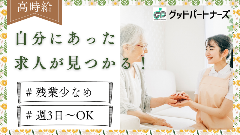企業のセールスポイント グッドパートナーズは、介護・看護・訪問サービス・清掃など、ライフスタイルに合わせて選べる多彩なお仕事をご紹介しております。 ブランクがある方や未経験の方も安心して始められるよう、専任スタッフが親身にサポートします。 あなたの希望やライフスタイルをじっくり伺い、 ぴったりのお仕事との出会いをお手伝いする、 あなたのためのお仕事パートナーです。