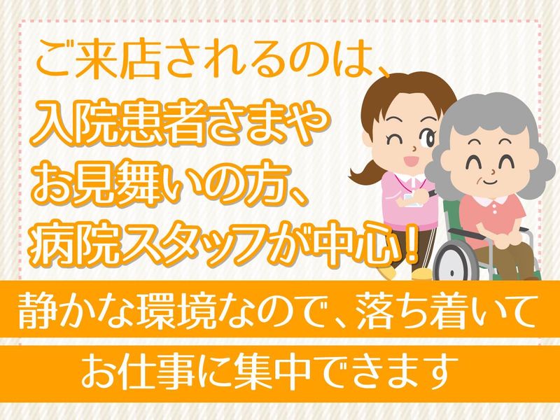 仕事内容 ★お任せするお仕事は… レジ打ちや接客など、 売店でのお客様対応がメイン。 トイレ清掃やお酒・タバコの販売、 揚げ物調理などはありません! 小さめの店舗なので、 無理なくお仕事ができます。 ★働く環境について 病院内の売店だから清潔感が抜群で、 空調もしっかり整っています。 ご来店されるのは 入院患者さまやお見舞いの方、 病院スタッフが中心です。 静かな環境なので 落ち着いてお仕事に集中できます。 -------------------- ★未経験でも安心してスタートできます 難しい作業は一切ありません。 先輩スタッフがマンツーマンで サポートします。 初めてのパートで不安な方でも 安心して始められます。 慣れてくると、自分のペースで お仕事ができるようになります。 ★ここがポイント 清潔で快適な職場環境なので働きやすい! ご来店される方が限定的なので、 ゆっくりと接客ができます。 お客様から直接「ありがとう」が聞ける、 やりがいのあるお仕事です! -------------------- ★こんな方にピッタリです ・誰かの役に立つ仕事がしたいという思いがある方 ・落ち着いた職場で長く安定して働きたい方 ・お久しぶりのお仕事の方 ★異業種からのチャレンジも歓迎します スーパーやドラッグストア、アパレル、薬局、 コンビニなどでの経験がある方はもちろん、 事務や営業職など接客経験がない方も大歓迎です。 一緒に患者さんや病院で働く方々を支えませんか? お気軽にご応募ください。