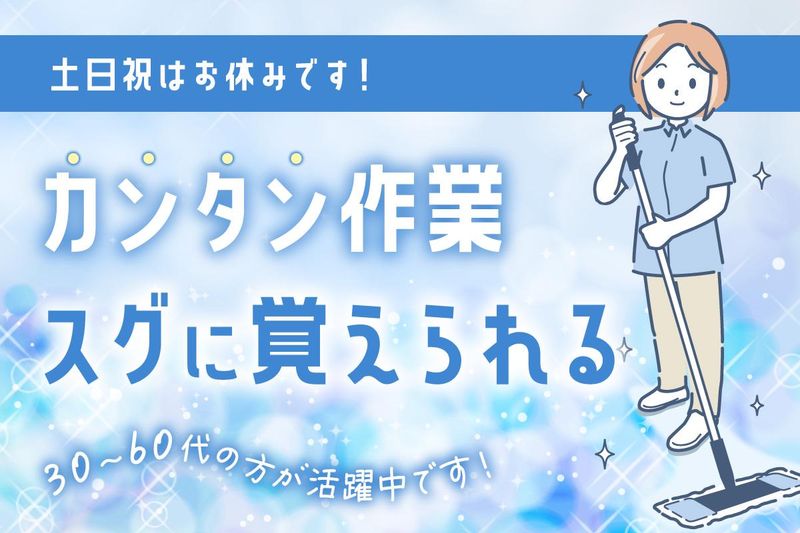 求めている人材 \\こんな方大歓迎// ◆平日午前中に働きたい方 ◆扶養内で働きたい方 ◆子育て中の主婦の方 ◆子育ての落ち着いた主婦の方 ◆一人もくもくと作業したい方 ◆久しぶりに社会復帰を目指す方 ◆50代~70代まで幅広く活躍中! ⭐いつもの家事を行う要領で働けるので、 家事スキルを活かしたい方にピッタリです! ⭐家庭と両立したい主婦さんに おすすめです! ⭐マンション管理員、マンション管理人、 ホテル関連スタッフなどの 経験者も歓迎します!